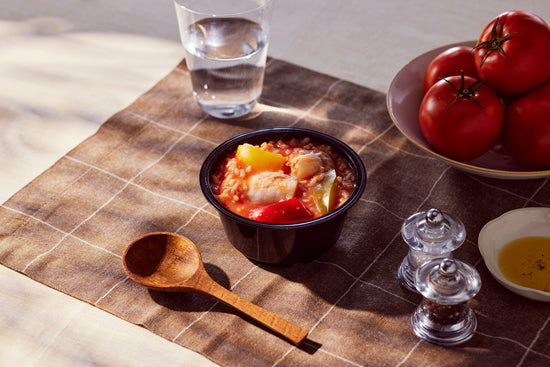 おどろくほど大きい魚の切り身をどどんと一枚乗せました。淡泊な白身魚と貝柱は、貝だしを効かせたトマトスープと相性抜群です。とろけるチーズをのせて電子レンジにかけてリゾット風にするのもおすすめ。