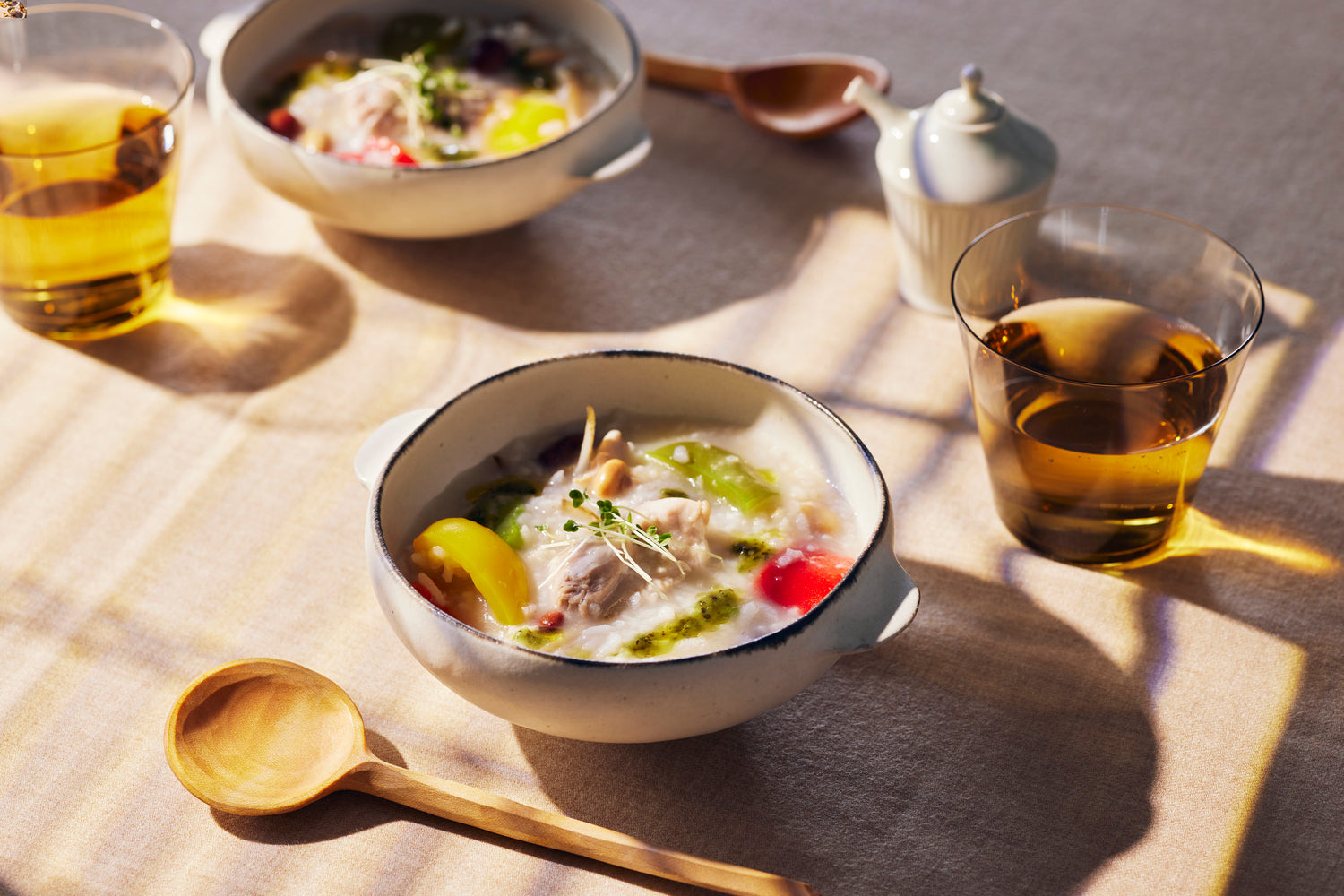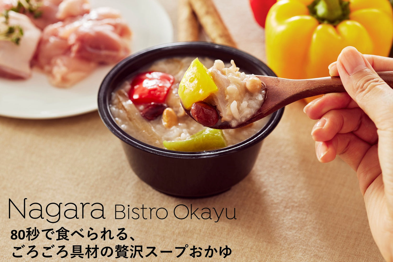 "Nagaraビストロおかゆ"はごろごろ具材の贅沢スープおかゆ。