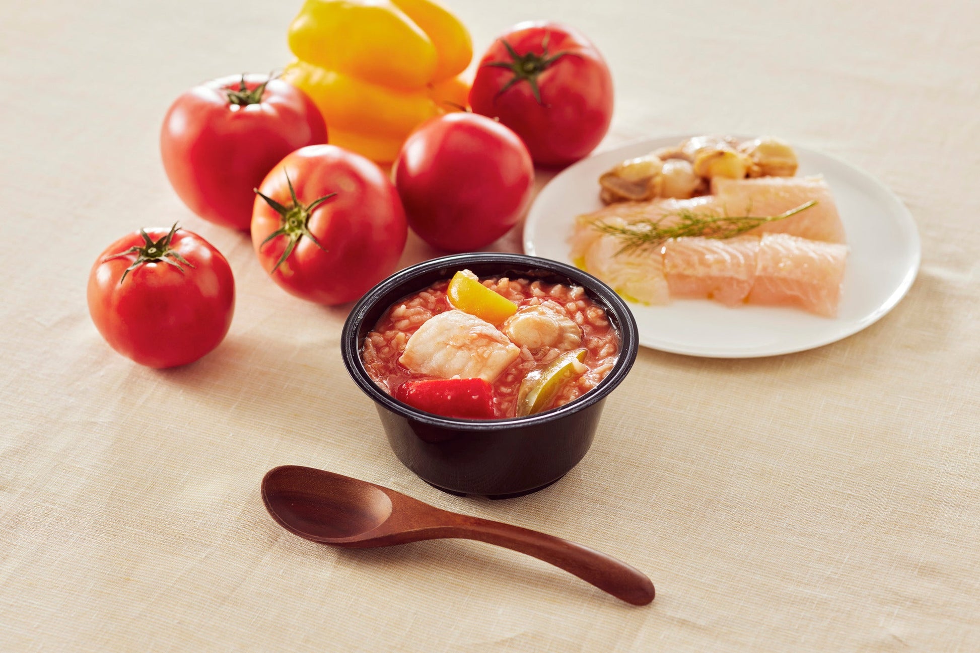 おどろくほど大きい魚の切り身をどどんと一枚乗せました。淡泊な白身魚と貝柱は、貝だしを効かせたトマトスープと相性抜群です。とろけるチーズをのせて電子レンジにかけてリゾット風にするのもおすすめ。